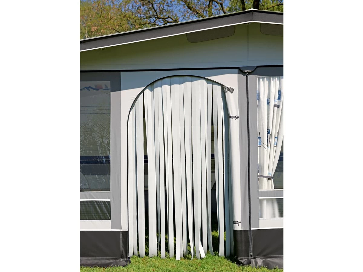 Brand heeft voor alle voortenten met een pees boven de deur dit vliegengordijn ontwikkeld zodat insecten buiten de voortent blijven. Het vliegengordijn houdt ook zonlicht buiten de tent en zorgt ervoor dat de privacy van uw voortent gewaarborgd blijft. Het vliegengordijn is standaard al voorzien van gordijnrunners zodat deze direct aan de pees boven de deur gehangen kan worden.