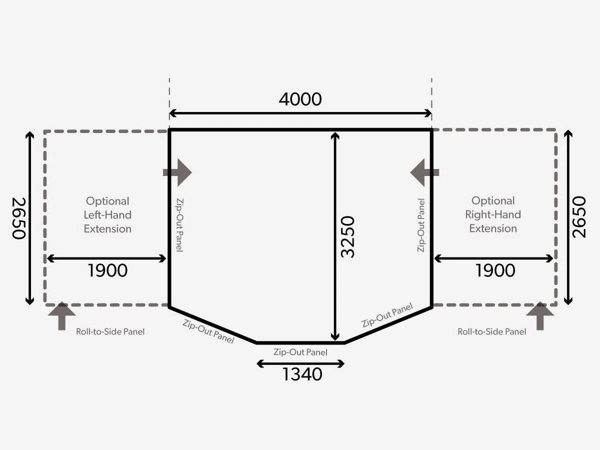 De voortent is 400 cm breed. Dit betekent dat je bij een caravan een rechte rail van minstens 400 cm nodig hebt om de voortent op te kunnen zetten. Wil je de voortent in de rail van je luifel schuiven? Dan moet de luifel minstens 400 cm lang zijn.