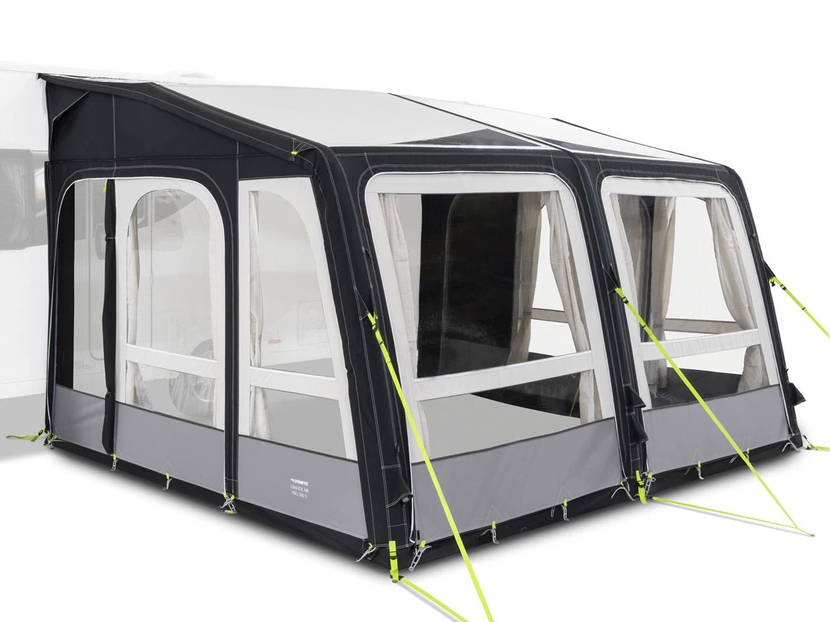De Grande Air Pro 390 M is uit te breiden met diverse accessoires, zoals bijv. een aanbouw, tenttapijt, binnenhemel tegen condensvorming en set horrengaaspanelen voor extra ventilatie.