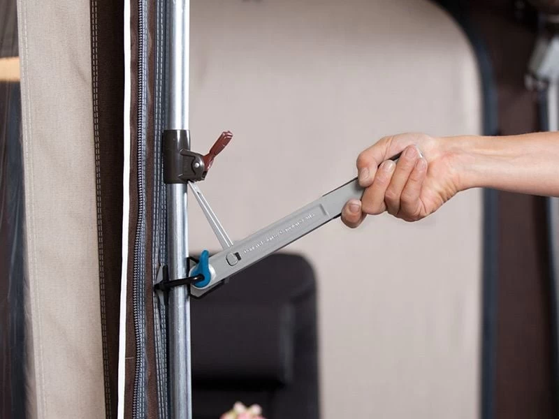 De Isabella Hercules Triple is een uniek stuk gereedschap voor het afspannen van je voortent, zodat het tentdoek optimaal gespannen is. Zo wordt flapperen voorkomen en krijgt de tent meer stabiliteit. Dit komt de levensduur van de voortent ten goede, omdat alle onderdelen gelijkmatig worden belast.