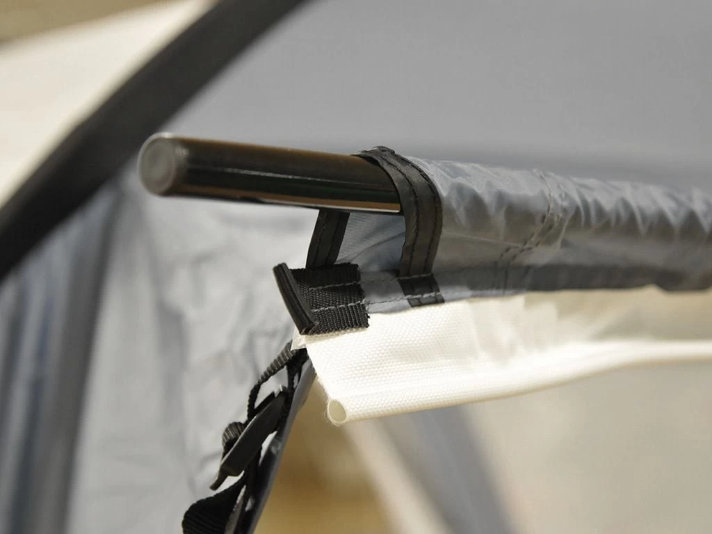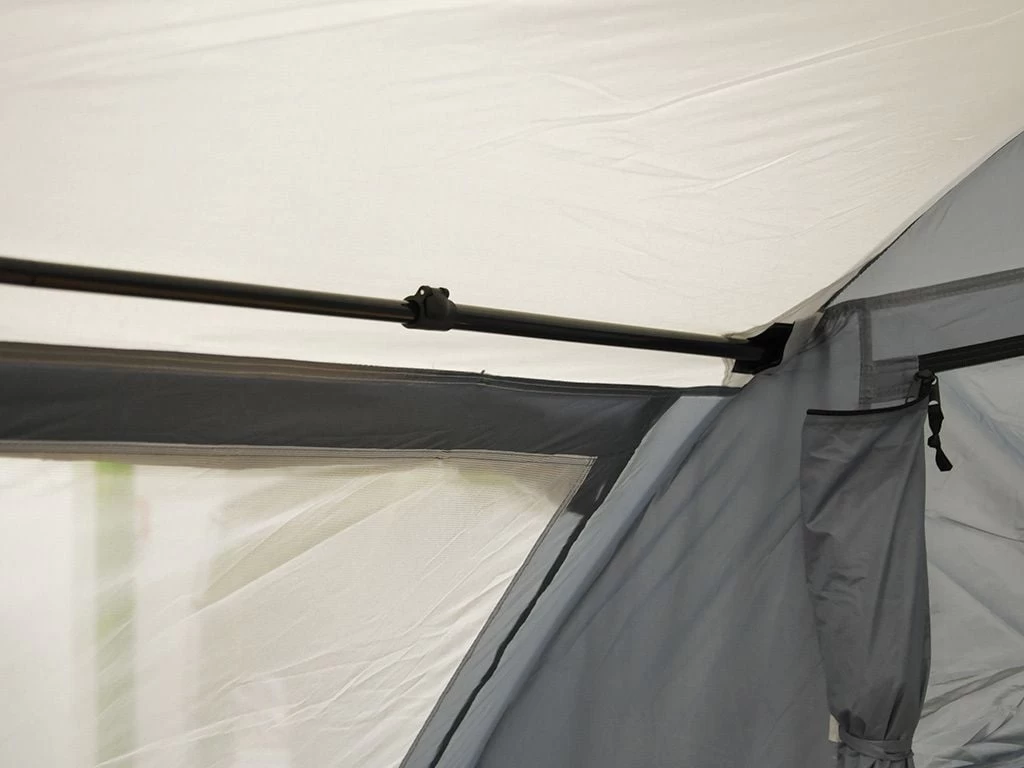 Het bevestigen van de Trinity is fluitje van een cent. De aansluitflap die zich aan de achterzijde van de tent bevindt kan met slechts twee scheerlijnen over het dak van je busje getrokken worden. Aan de andere zijde zet je ze vast met een haring. Is je busje voorzien van een regengoot dan kun je de aansluitflap met de meegeleverde stang en en klemmen eenvoudig aan de regengoot vastklemmen. Heeft je bus een tentrail dan kun je de pees van de aansluitflap ook direct in de tentrail schuiven. Wil je de Trinity nog sneller en makkelijker aan en af koppelen? Kies dan voor de optionele zuignappen of magneetadapter.
