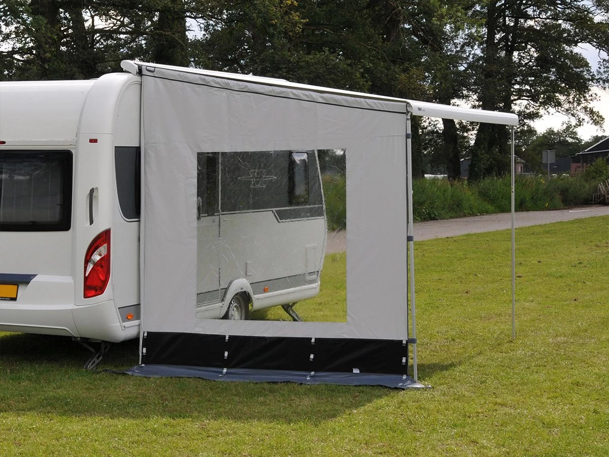 Aan de achterkant zit een schuimkussen genaaid, met een optionele aandrukstang kan je het schuimkussen tegen de wand van je camper of caravan drukken. Zo sluit de zijwand mooi tegen je voertuig aan.