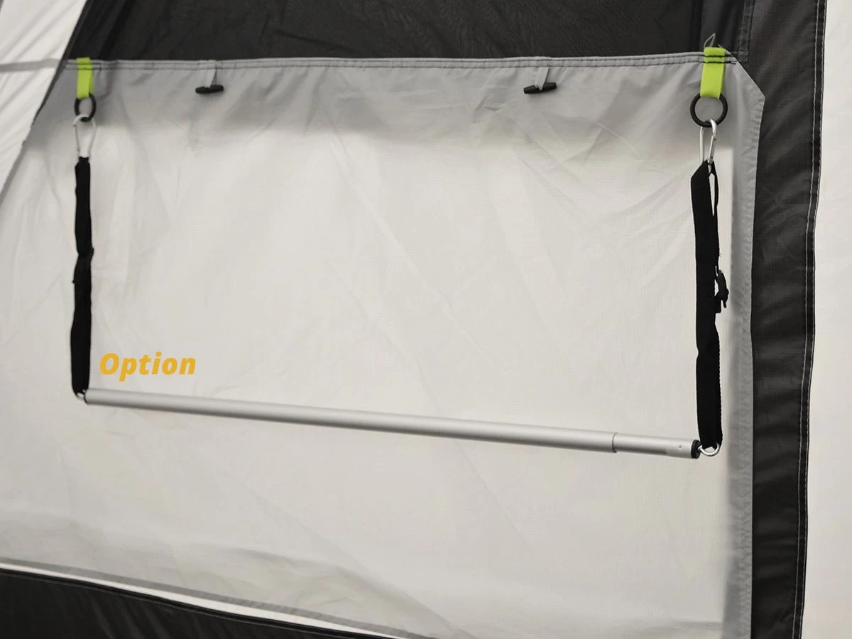 De voorwand van de Viera 260 bestaat uit twee panelen. Het linker paneel is volledig omhoog te ritsen en kan bovendien ook uitgezet worden als luifeltje met de meegelverde luifelstaanders, scheerlijnen en haringen. De grote ramen in de voor- en zijwand zijn van binnenuit af te dekken met een dichte afdekflap wanneer extra privacy gewenst is. Voor extra ventilatie is de bovenste helft van beide zijramen voorzien van horrengaas. Het horrengaas is van buitenaf te bedekken met een afdekflap. Beide zijdeuren zijn naast de dichte deur ook voorzien van een gaasdeur. Zo kun je op een warme zomerdag alles open gooien zonder dat er insecten binnen komen. Voor een mooie aansluiting tegen de caravan zijn de zijwanden voorzien van een dikke schuimrand om tocht en wind buiten te houden. Aan de onderzijde van het tentdoek zitten slikranden die onder het meegeleverde grondzeil gevouwen kunnen worden om regenwater en ongedierte zoveel mogelijk buiten de tent te houden.