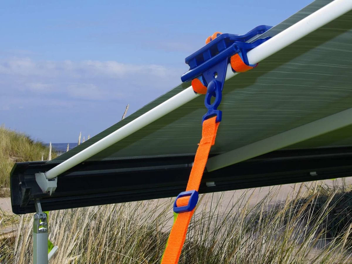 Als je een zijwand aan je luifel hebt hangen en de Antiflap dus niet aan de stang kan bevestigen, kan je met de optionele Tie Strap alsnog meer spanning op je doek brengen. Ook zorgt dit ervoor dat het luifeldoek strakker op je zijwand aansluit en er dus minder kans is op inregenen.