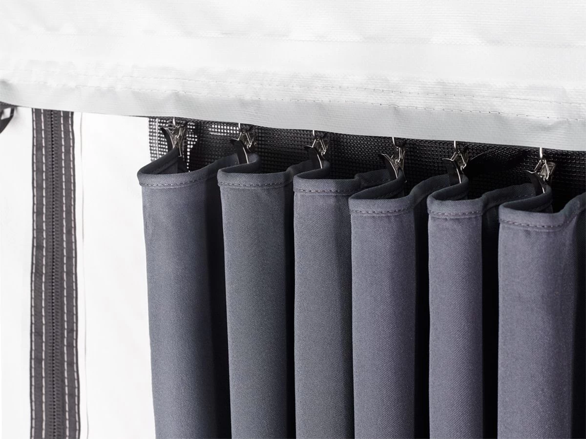 De Gordijnenset is donkergrijs van kleur en is verkrijgbaar in 3 verschillende sets. Deze set is geschikt voor de Thule Residence G3 300-400 en de Thule Panorama 300-450.